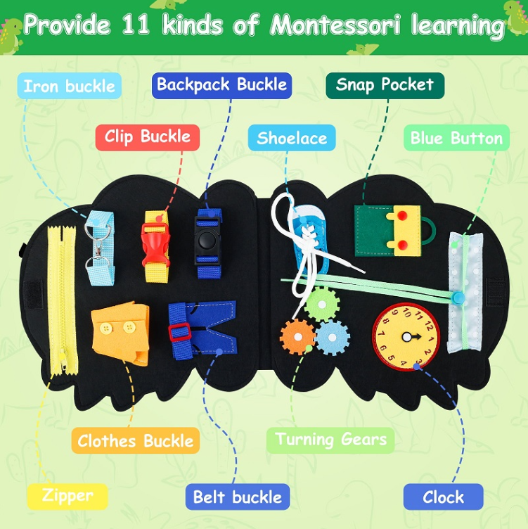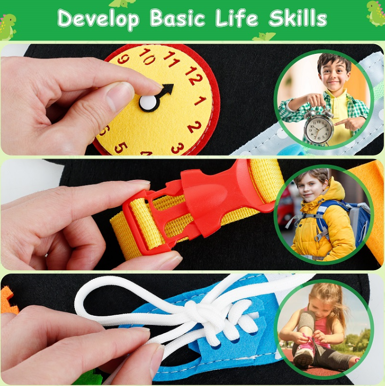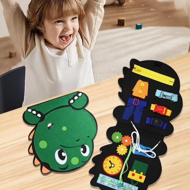 This busy board contains various activities for toddlers providing zippers, shoelaces, buttons, belt buckles, clocks and more. With this dinosaur busy board, children will learn basic life skills, fine motor skills, dressing skills and cognitive skills.